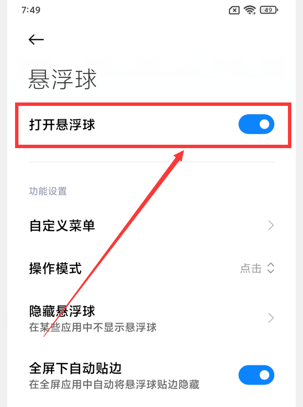 点击“打开悬浮球”右侧的开关,把它变成蓝色,就开启成功,然后就可以悬浮球截屏了。