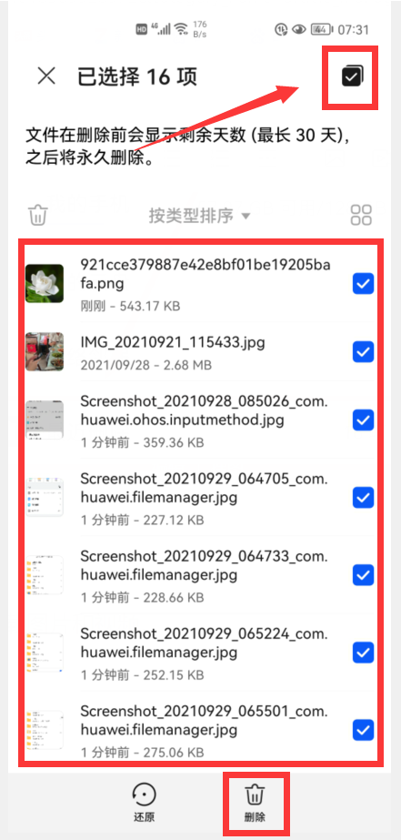 点击“最近删除”,就会显示“回收站”里所有的被删除的文件。用手指长按某一条文件,屏幕右上角就会显示一个“全选”的按钮(如下图),点击它,就会选择所有的文件。